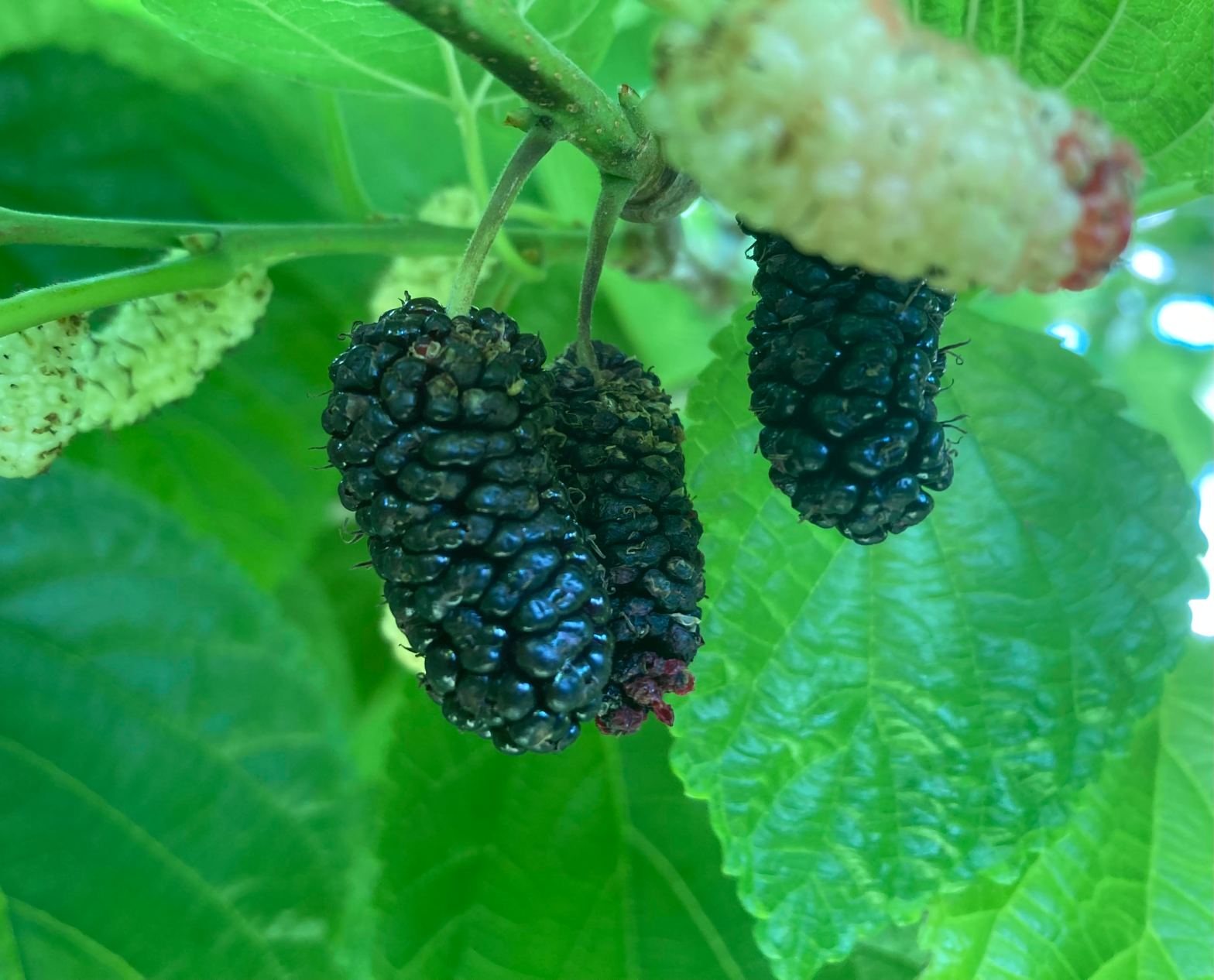 My mulberry tree started as a cutting from a local botanist. I planted it in the front yard, and watched it survive weedwacking multiple times, which seemed to spur it on to aggressive growth. When it achieved about three feet of vertical growth it produced its first crimson-colored, sweet berry. And I was hooked.